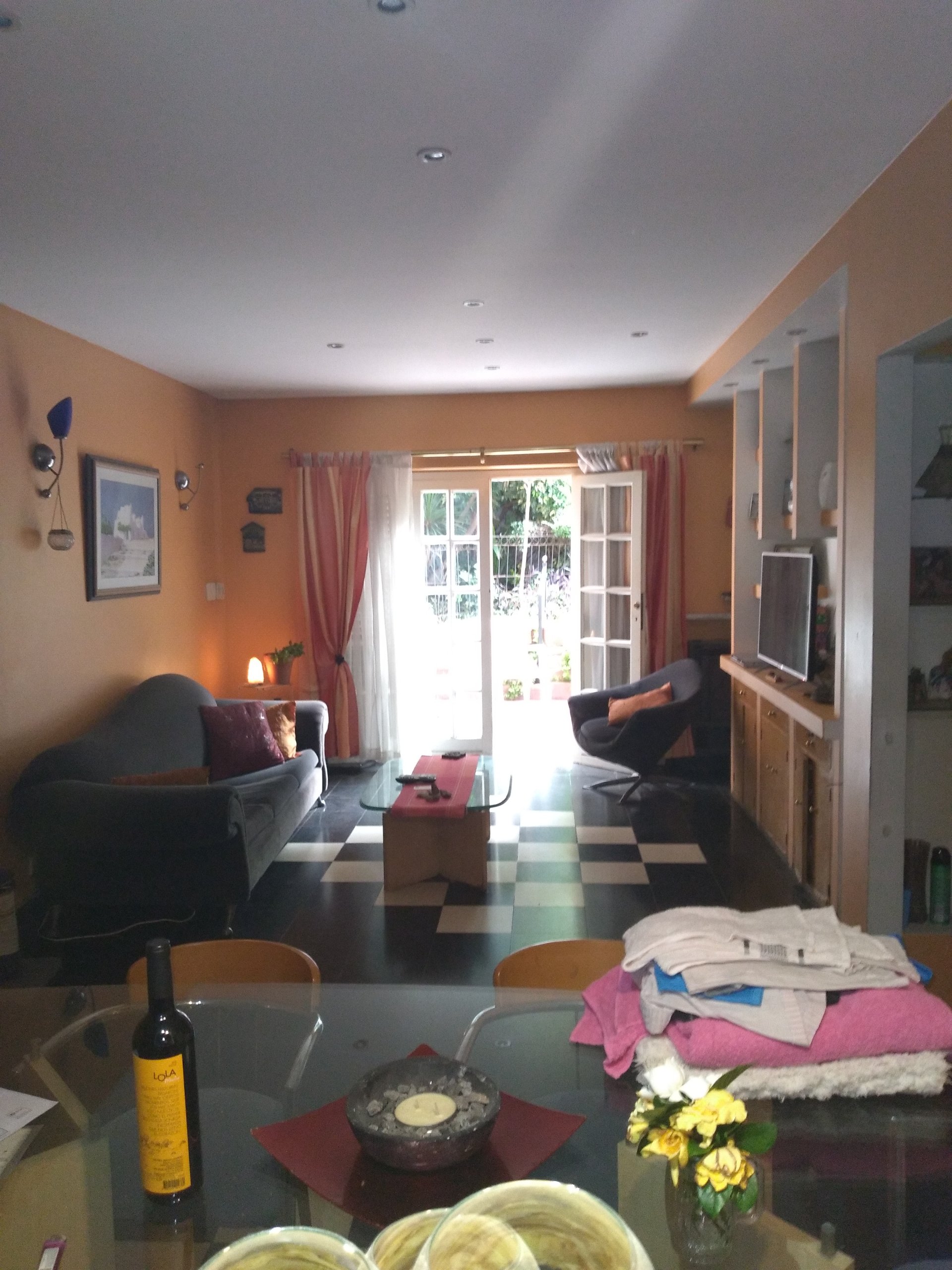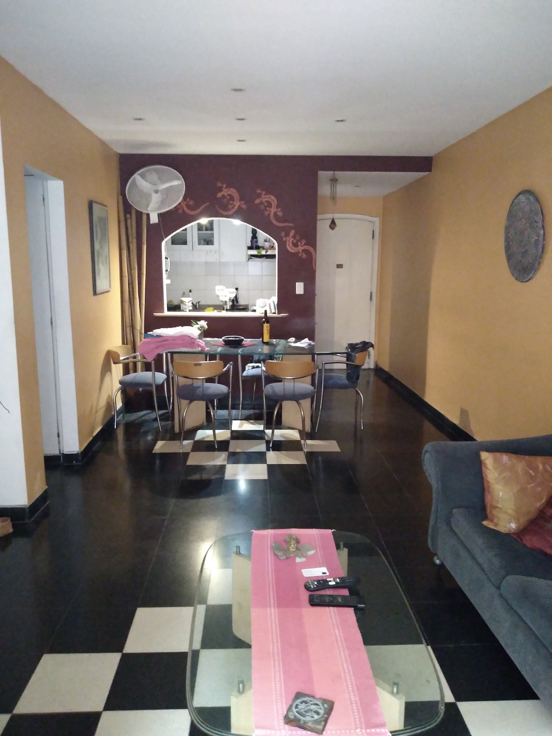 Living comedor de aprox 4 x 8 con pisos de granito negro y blanco, tiro balanceado,techos bajos con dicroicas led empotradas. Con ventanal al patio jardin.
