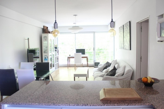 Living-comedor de 8,20 x 3,80 mts., con aire acondicionado, y cocina integrada con una barra-desayunador de 3,40 x 2,10 mts..
