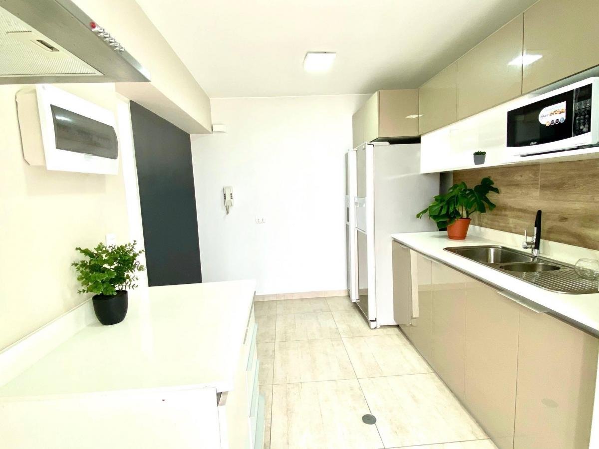 La sala comedor es bastante espaciosa , la cocina tiene un diseño moderno con lindos reposteros altos y bajos igualmente de melamine high gloss con holgada capacidad de almacenamiento; además hay área como para un comedor de diario o barra de desayuno. Está equipada con una refrigeradora side by side Samsung, con enchape de espejos bronce en las puertas que combinan bastante bien con el diseño integral de la cocina, microondas, lavaseca, terma,campana extractora, rollers, luminarias. Se han conservado los pisos de madera originales y están tratados con dedé.