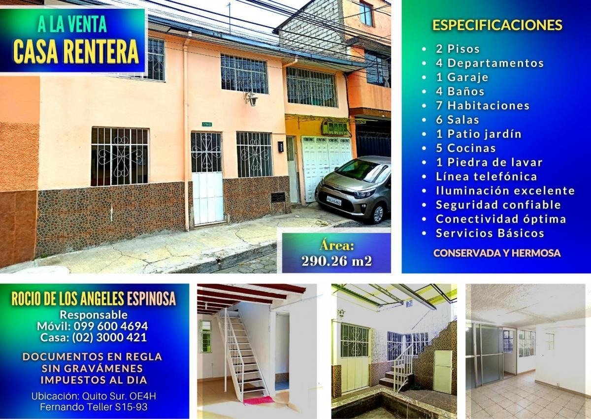 Se Vende hermosa casa rentera, conformada por 4 Departamentos, ubicada en el sector de la Quito Sur, media cuadra de la Av. Cardenal de la Torre y del Parque Lineal (de los Tubos), cercana a la Parroquia Cristo Resucitado de la Quito Sur (Iglesia Católica), al metro y del Colegio Consejo Provincial de Pichincha, al hospital un Canto a la Vida, ya las canchas sintéticas de la Quito Sur.