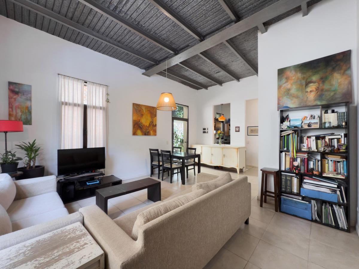 PLANTA BAJA (ambientes con techos altos de material desplegable y vigas de hierro en T): Living Comedor con salida a un primer Patio Solar, Cocina semi abierta, Baño completo y Dormitorio con salida a segundo Patio Solar. PRIMER PISO: Dormitorio con vestidor y baño ventilado en suite, con salida a una Terraza en el mismo piso a través de la cual se accede a un amplio Estudio Exterior -acceso vía terraza- ideal para conciliar vivienda con trabajo; con posibilidad de ser un Tercer dormitorio.