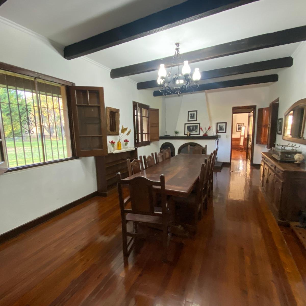 - INMENSO COMEDOR CON SALIDA A LA GALERIA, EL CUAL CUENTA CON MESA LARGA PARA 16 PERSONAS Y HOGAR A LEÑA.