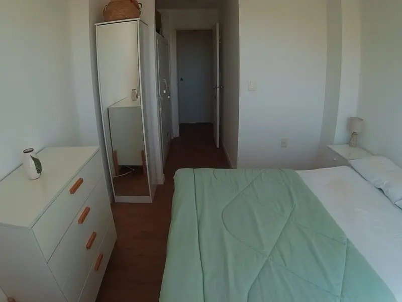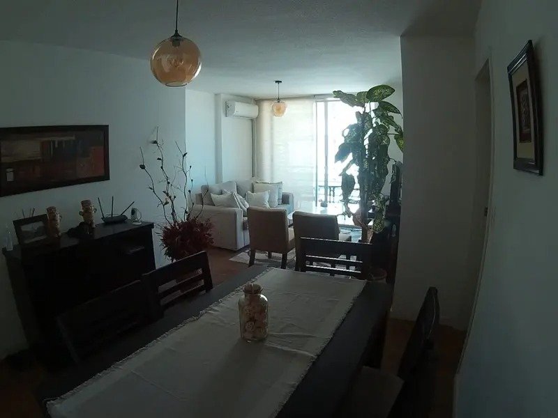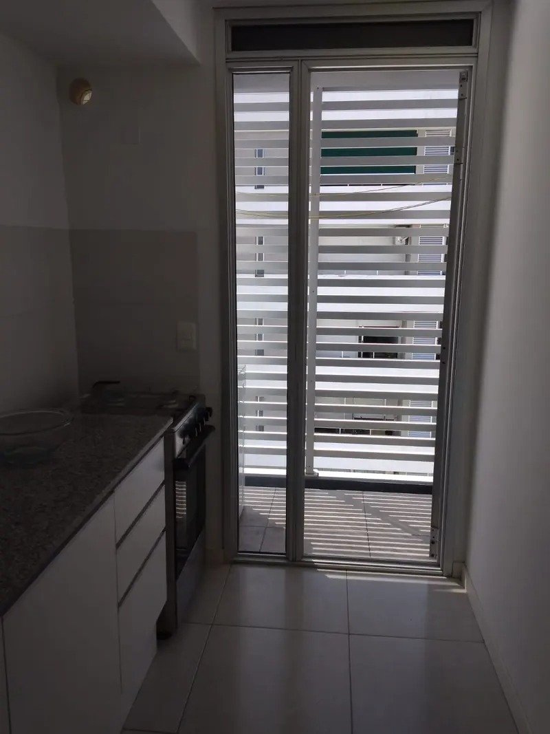 Piso 8, dos dormitorios, cocina definida con placares bajo mesada, baño completo con mueble en melamínico, terraza de servicio en cocina con conexión para calefón y lavarropas, y terraza principal con vista panorámica en living-comedor.