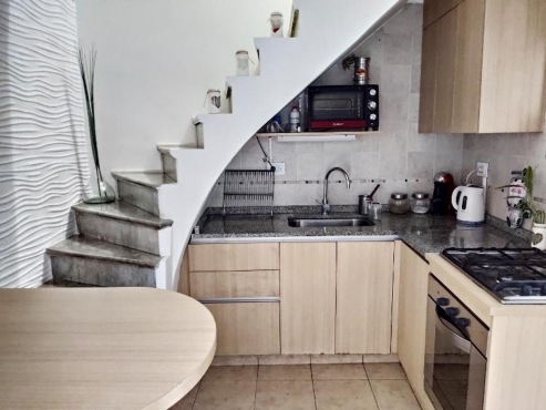 Dormitorio principal con pisos entarugados y placard con puertas corredizas e interiores completos. Segundo dormitorio con entrepiso o playroom y placard. Baño completo, sanitarios y accesorios de primera calidad en el mercado, bacha de apoyo, mesada, espacio de guardado, bañera y extractor. Patio con cerramiento en aluminio con sector lavadero compuesto de amoblamiento, mesada, bacha y conexión para lavarropas. En altos con acceso interno dependencia o tercer dormitorio de 3 x 3 + toilette.